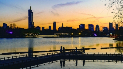 玄武湖畔:晚霞金色光影,勾勒城市绮景