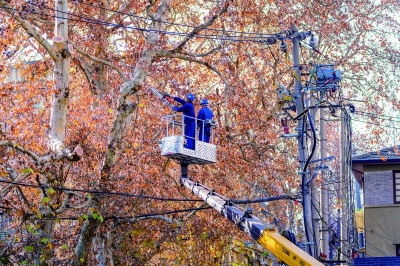 近日,国网南京供电公司联动园林、交管部门,在秦淮区五福巷对10千伏党校线开展应急消缺作业。工作人员借助高空作业设备,修剪影响线路安全的树木,及时消除安全隐患,切实保障辖区居民与单位的可靠用电。