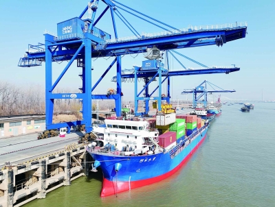 日,南京港江北集装箱码头一派繁忙景象,货轮、卡车有序作业。该码头