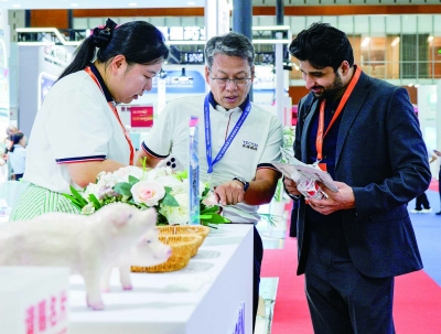 9月10日,2025亚洲国际集约化畜牧业展览会在南京国际博览中心举行,近500家行业龙头企业参展,涵盖智慧养殖设备、育种孵化、食品加工等领域最新产品和技术。图为一家动物疫苗展商正与外国客商洽谈业务。