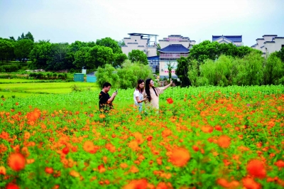 9月18日,高淳国际慢城景区内,游客正在花丛中赏景游览。眼下,当地栽种的150多亩波斯菊竞相开放,金灿灿的花海描绘出迷人的景色。