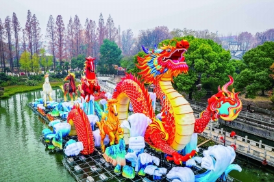 12月21日,南京白鹭洲新年灯彩“灯王”正式亮相。该灯组长60米、高15米,取材“五马渡江,一马化龙”典故,以声光电科技复现神骏渡江、化龙腾起的场景。巨龙昂首吐纳云气,龙珠闪转生光,融入马年生肖巧思,既承载华夏文明延续的文化寓意,又传递吉祥祝福与城市奋进活力。